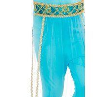 • Arabian style deluxe jumpsuit in shiny fabric with embellished bodice featuring faux jewels and gold edging, plus caped sleeves