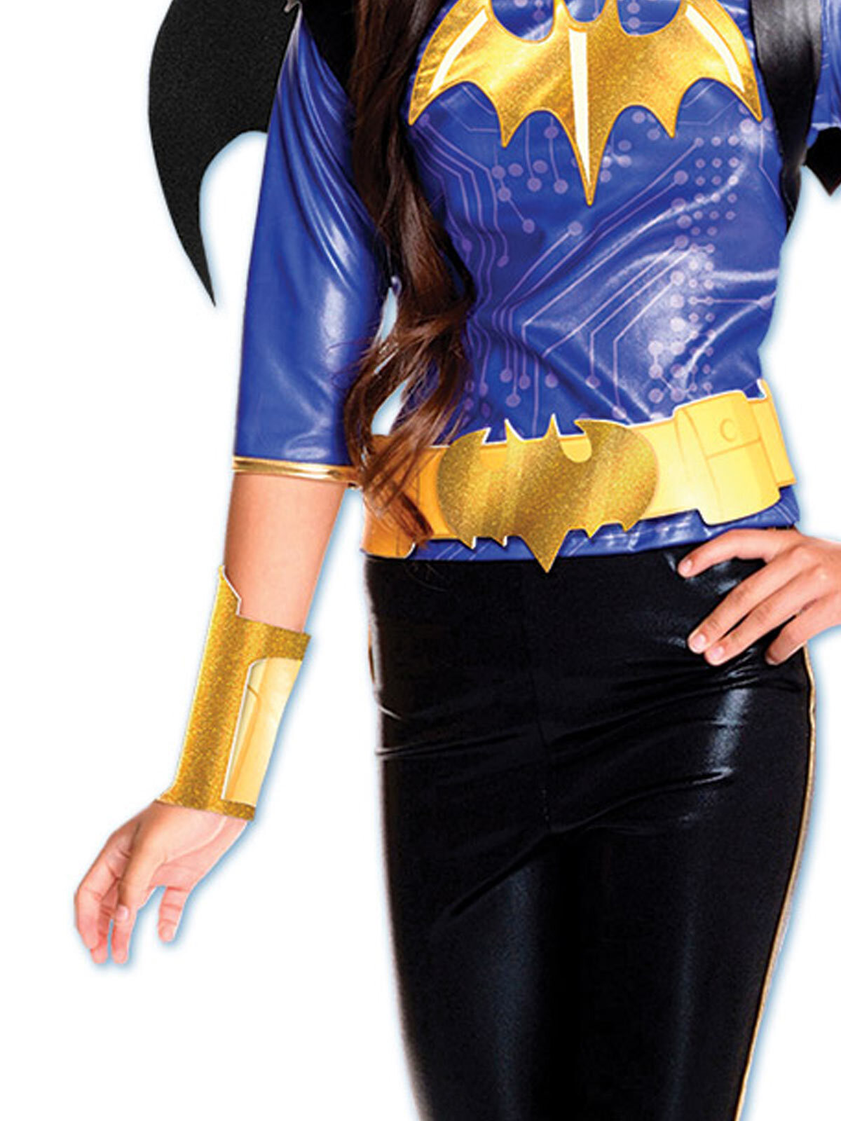 • Hooded top in shiny fabric with digital print on bodice, attached bat symbol on chest, 3/4 lenth sleeves, ears on hood and gold trim