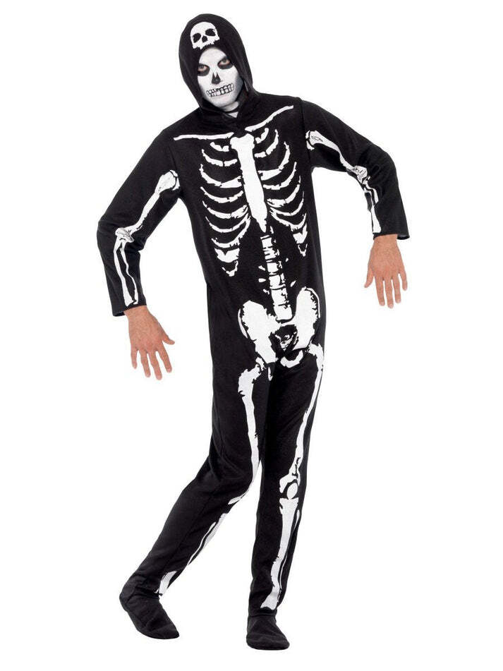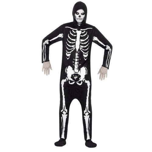 Check out our all-in-one Skeleton Costume jumpsuit. This costume comes in all black with a white skeletal human body print on the front with open ended long sleeves and an attached hood. This costume is perfect for any Halloween gathering you've got coming up soon or even for a PJ party! Have a look through our Make Up range to finish off this ghastly look.