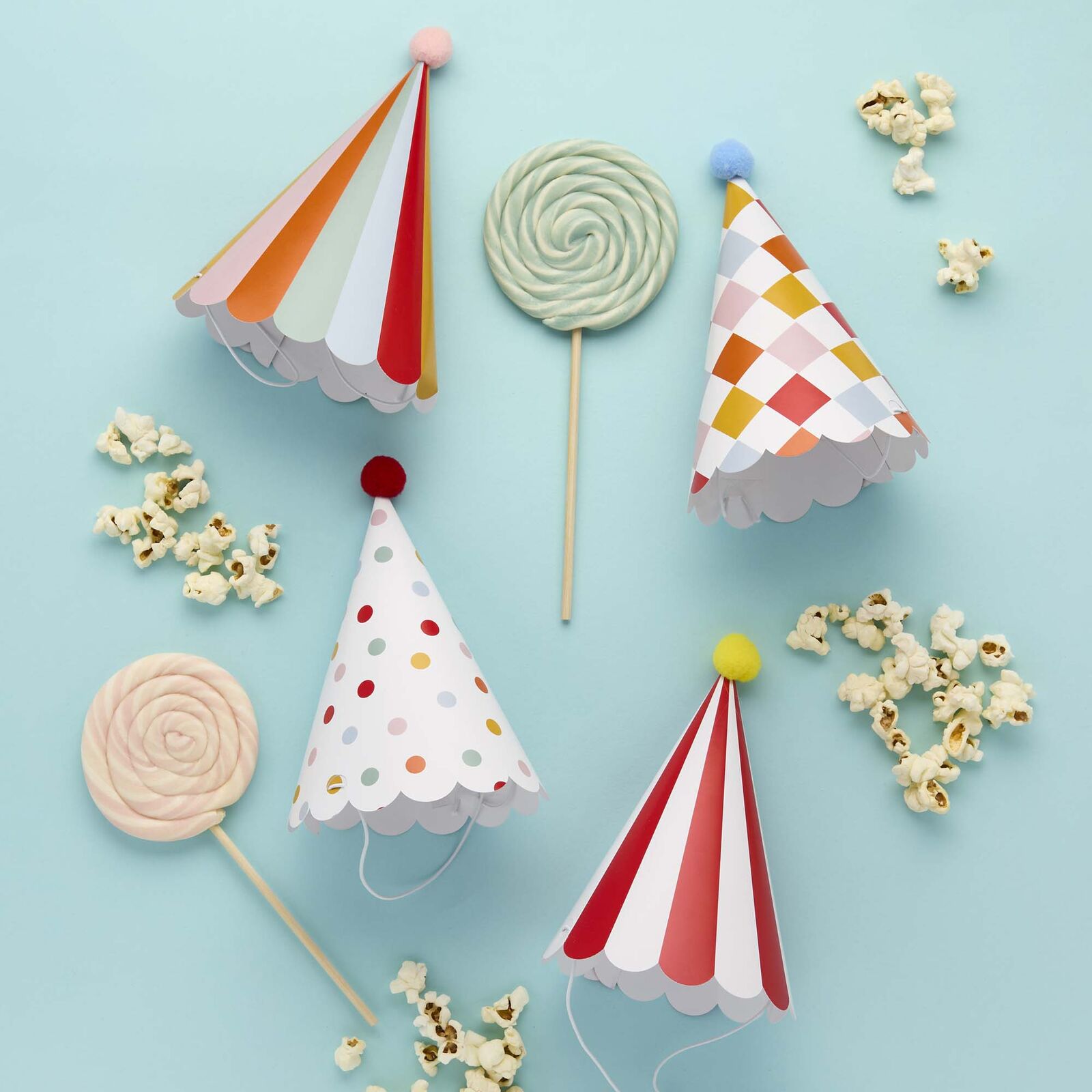 • Includes 8 Circus Party Party Hats with Pom Poms