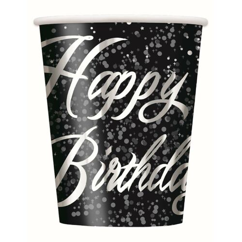 Glitz Silver Happy Birthday Foil stamped Paper Cups 8 Pack 270ml