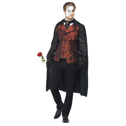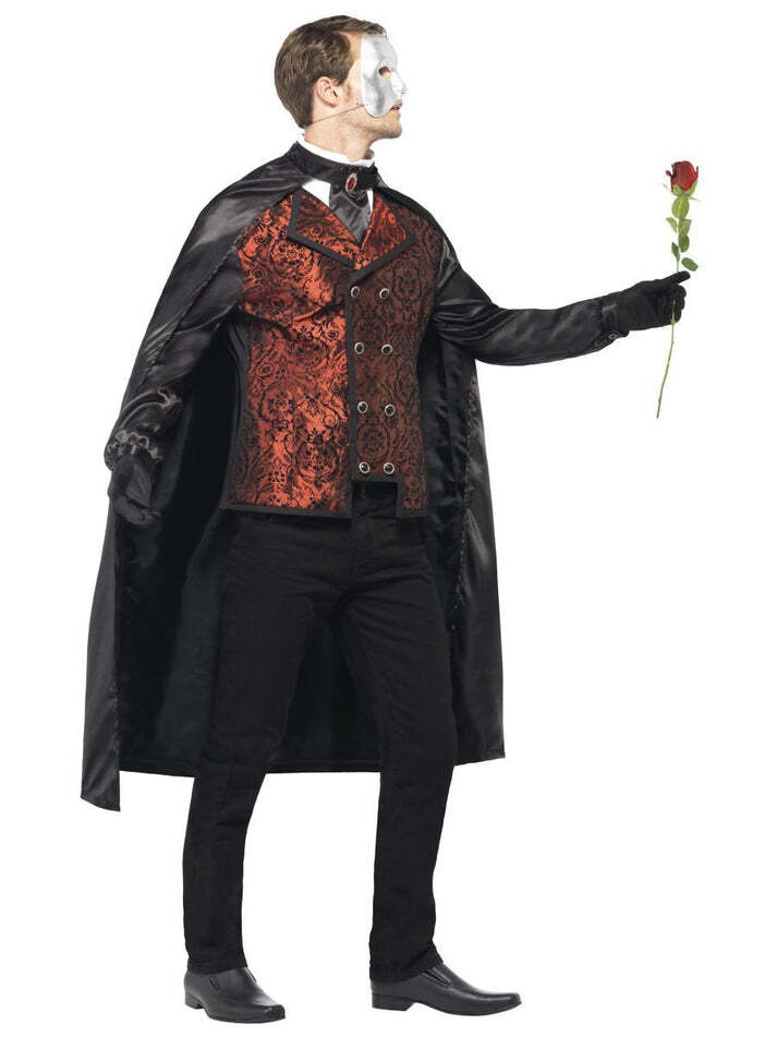 Come join us at Carnival of the Damned and watch our musicians swoon you with their voices. This Dark Opera Masquerade Costume really is one of a kind. It includes the marvellous, black, silk cape, a red detailed long sleeved mock shirt, material black gloves, the half silver face mask attached with elastic and a gorgeous red, faux rose. This costume is perfect for any Opera themed event or Masquerade ball. Shoes not included.