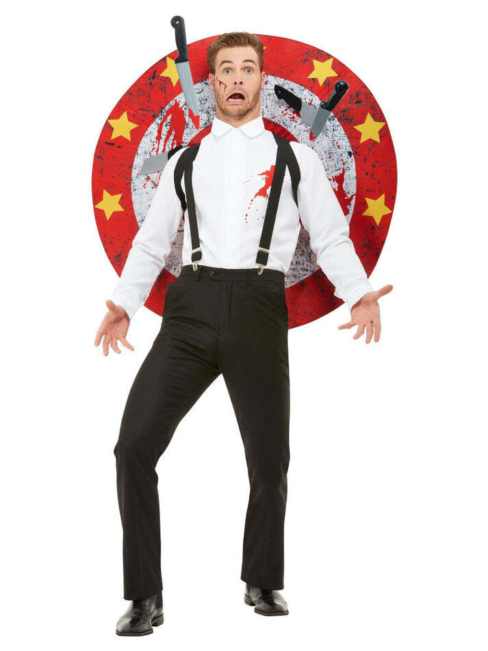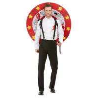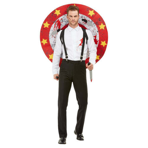 Be brave and show no fear at your next circus themed event in our Deluxe Knife Thrower Costume. This costume comes with a White shirt with Fake Blood stains on the front and a pair of adjustable Black Braces. The Target Board is made of Foam and has elastic straps for easy wear. The Knives are attached to the board with Velcro and can me taken off and re positioned on the board. Why not complete the look with some of our make up and blood.
