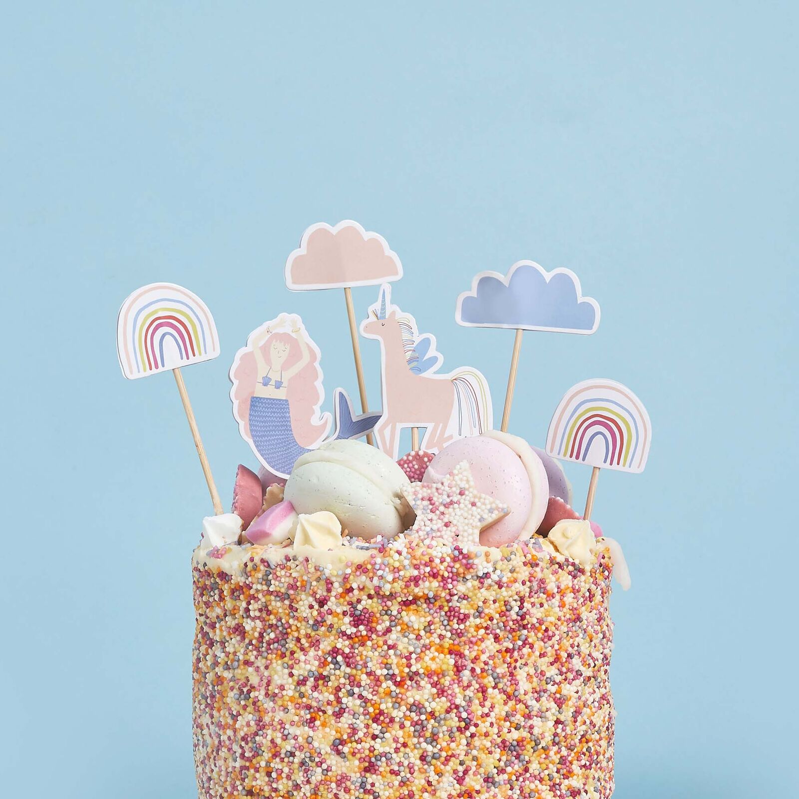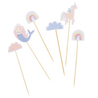 • Six magical toppers in playful rainbow and enchanted shapes.