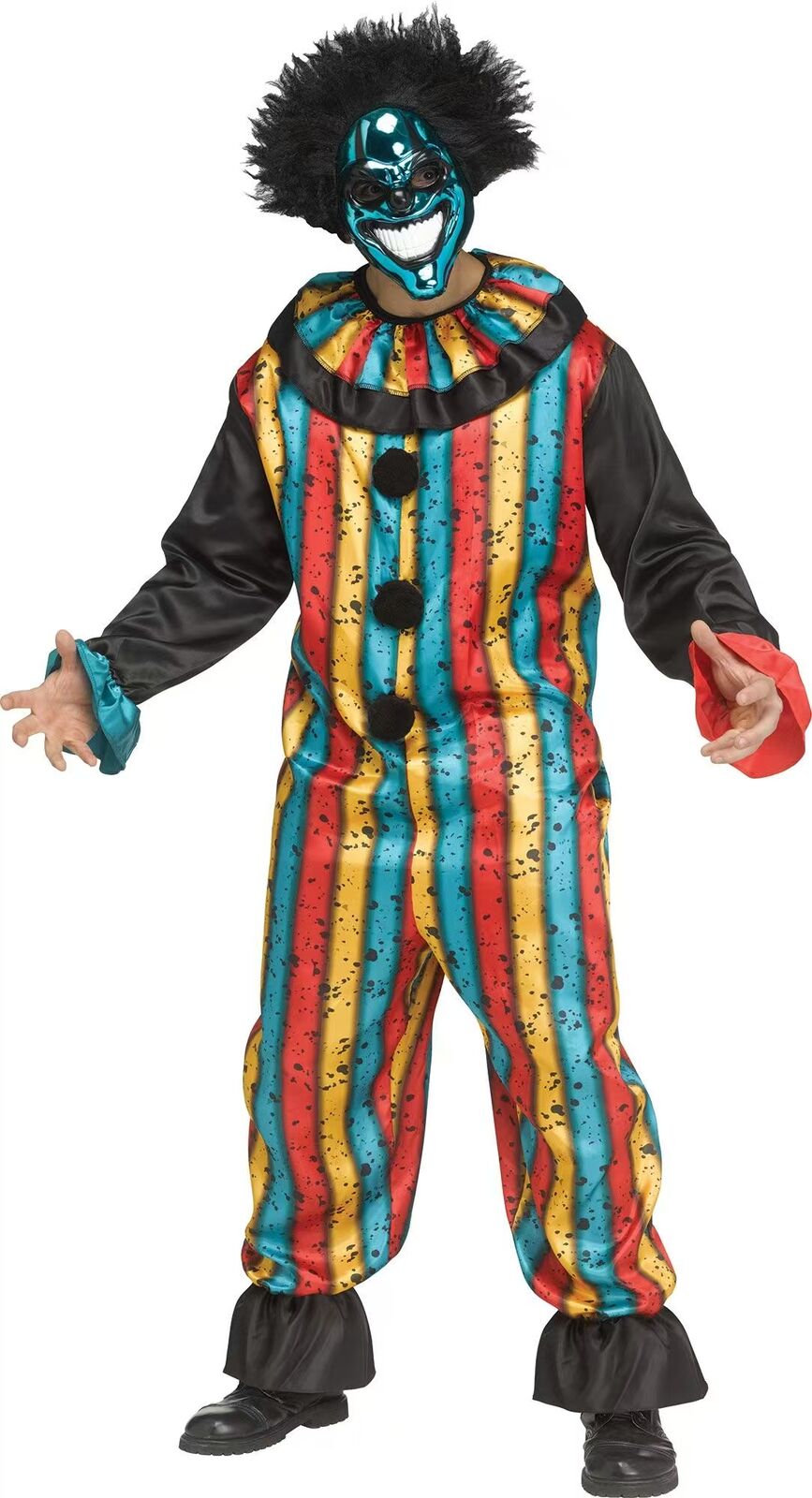 Step right up… to your worst nightmare! This Evil Carnival Clown Costume features a bold striped jumpsuit with oversized collar – the perfect creepy clown look for Halloween.