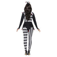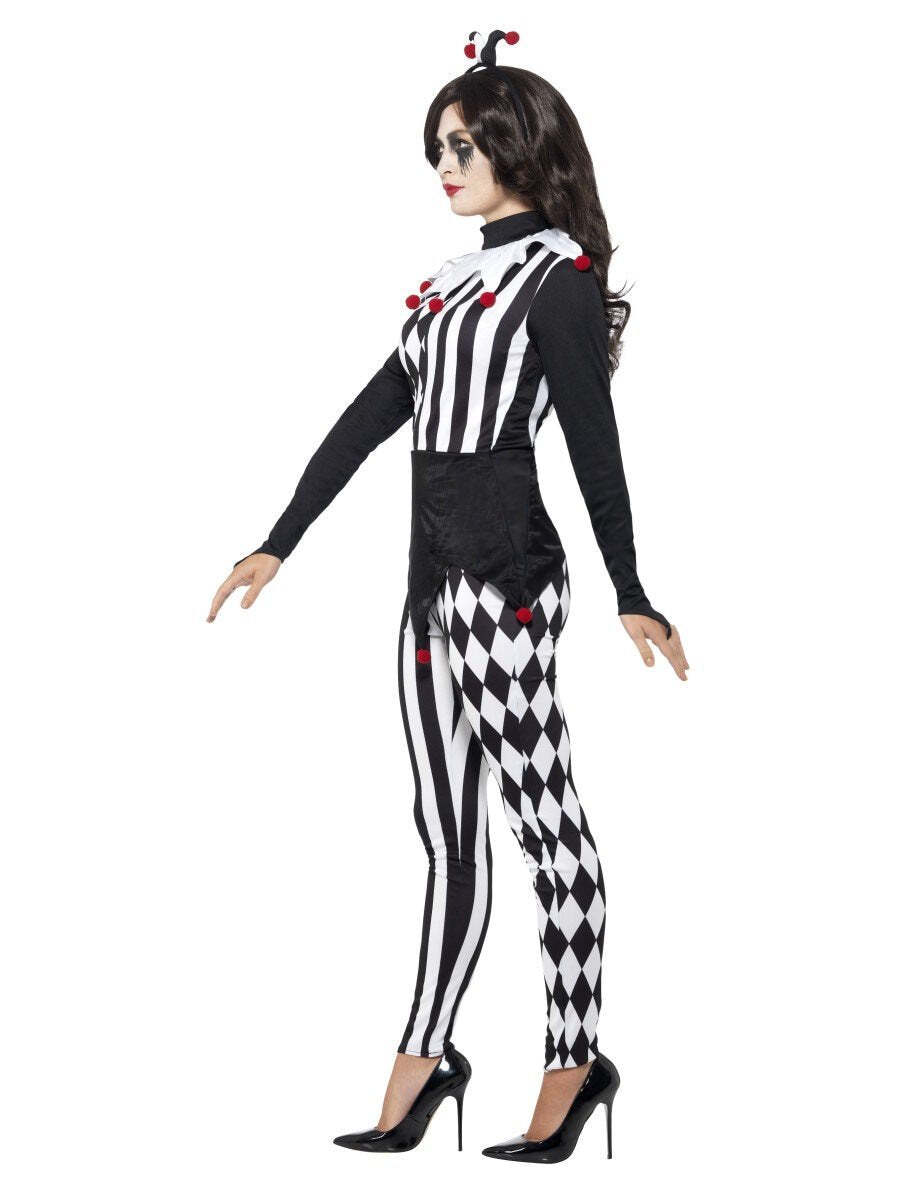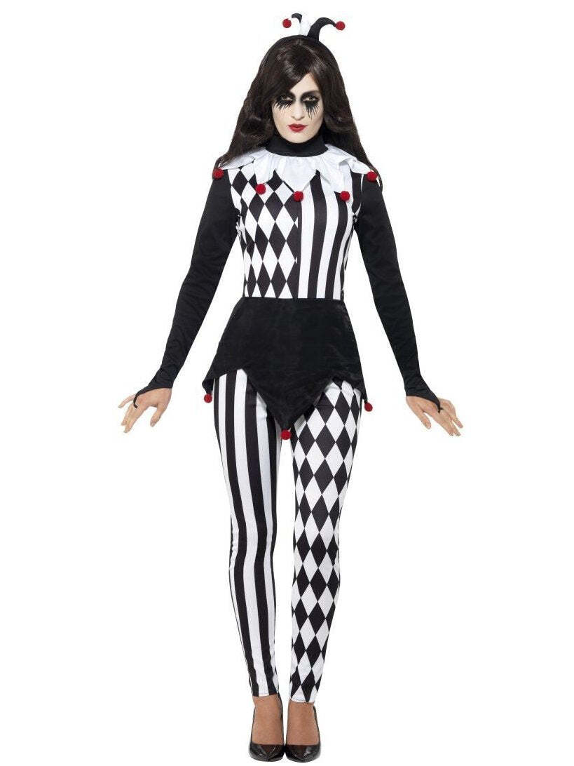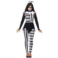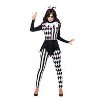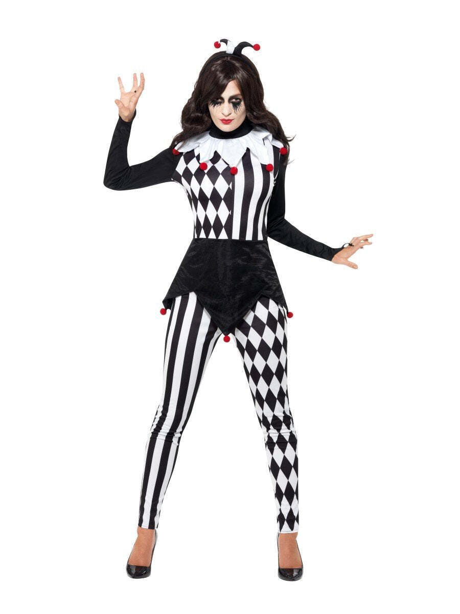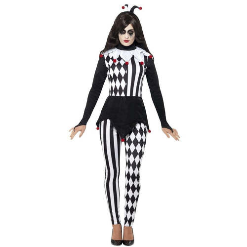 Step into the shadows of whimsy with our Female Jester Costume, a hauntingly enchanting ensemble that adds a touch of mystery and macabre allure to the circus tradition. Spread some Halloween fear! Includes Top, Leggings and Headband.