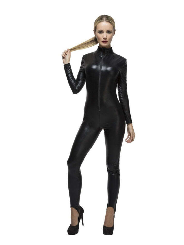 Who are you?" "i am miss whiplash". This seductive miss whiplash fancy dress costume from our fever range will definitely help define the strong from the weak! this figure hugging metallic all-in-one black zip up stretchy cat suit comes with stirrups at the foot to keep the cat suit taught.