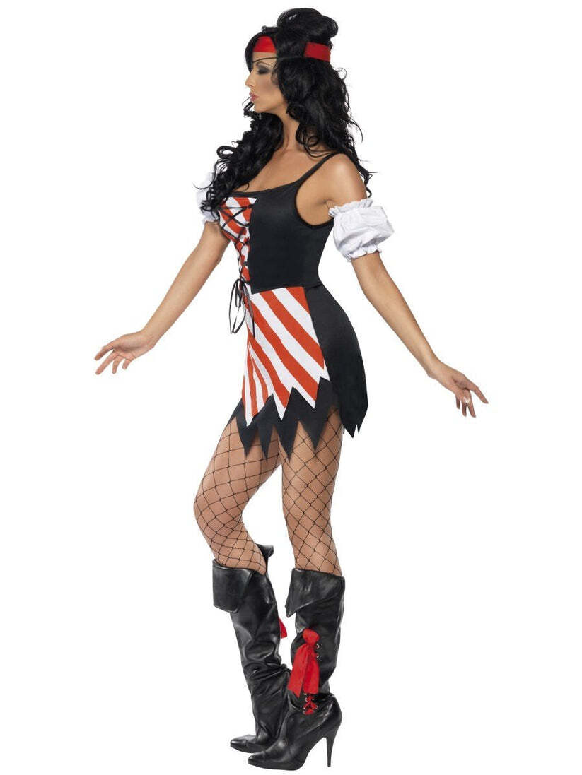Shiver me timbers! Let's sail the seven seas in style with our women's Fever pirate fancy dress costume. This costume comes complete with a black dress which features red and white striped detailing on the chest and skirt. Also included are white detachable Puff sleeves, a black eye patch and a red self tie scarf. Add our pirate pistol to complete this look.