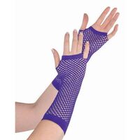 No 80s punk princess leaves the house without her Long Purple Fishnet Gloves Deluxe! These Purple fingerless gloves are made of stretch fishnet polyester fiber and extend all the way to the elbow. Heavy elastic bands at either end help to hold them in place.
