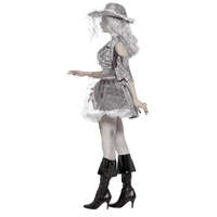 Welcome aboard in our Ghost Ship and get ready to sail the seven seas in our Ghost Ship Pirate Treasure Costume. This fantastic costume includes the well detailed, silvery/grey and white silk dress. It has extra lace trimmings around the hemlines in a gorgeous lace print with included tattered pieces. The silver jacket is sewn onto the dress to make this one piece look like a dress and coat. This costume also includes the amazing, wide brimmed, soft material hat with extra lace detailing as well. Add in our Ghost Ship Make Up Kit for those extra touches. Boots, wig and eye patch are not included with this costume.