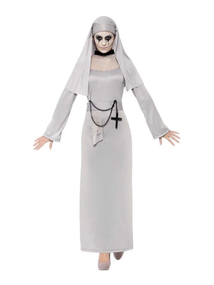 Our Gothic Nun's costume is the perfect costume for your next Halloween event. The costume comes with a Women's grey stretch knit long sleeved dress with grey lace insert at the neckline and black collar. Costume has an attached grey belt front with front drape with grey lace overlay. Nun's rosary beads in black with cross are attached to the front of the dress. Completing the Nun's Costume is a grey nun's headpiece. Don't forget to add one of our Gothic make Up kits to your order to complete the Look.