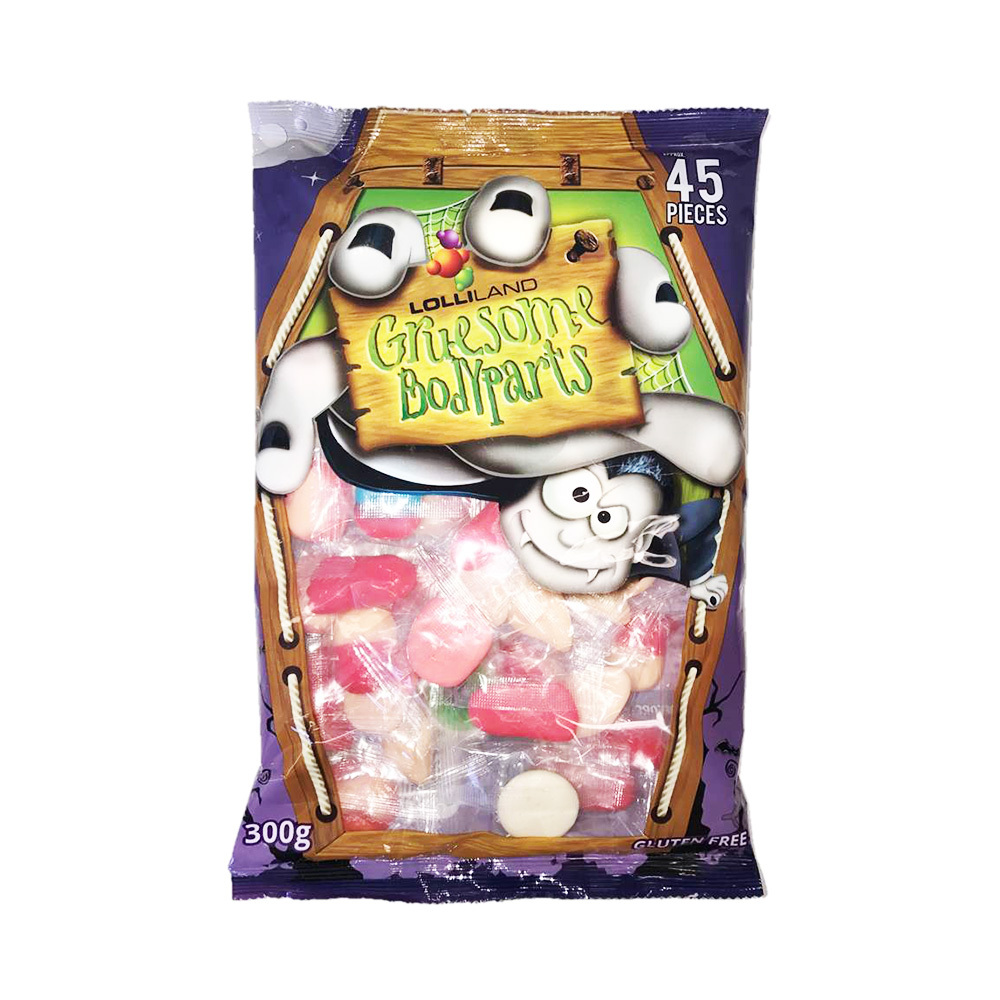 Unleash the horror with Gruesome Body Parts Lollies! This 45-piece bag is packed with delicious body part-shaped lollies, perfect for spooking your trick-or-treaters or adding a creepy touch to Halloween parties. These gluten-free treats are sure to make a frightfully fun snack!