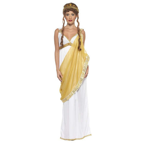 Considered the most beautiful women in the world by the greeks and her kidnapping influenced the Trojan war, our stunning adult women's Helen of Troy fancy dress Costume is sure to make a statement! Included in this desirable set is a stunning White and Gold long draping Dress and Tiara. Don't forget to check out our myths and legends wigs from our fancy dress accessories to complete this look!