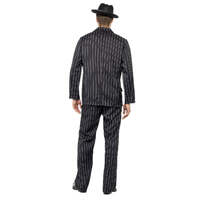 This is the perfect adult men's 1920's zoot gangster fancy dress costume with a stylish pinstripe jacket with a faux rose in the lapel and matching trousers with elasticated waist. The jacket also has a black silky shirt front accompanied with a white tie. Add our black fedora gangster hat to complete look.