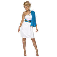 Unravel the myths of ancient time and seduce the Roman warriors with our women's Roman Beauty fancy dress costume. This exquisite costume comes complete with a gorgeous white toga style dress which features a blue shawl and a gold belt. Also included is a gold ancient leaf headpiece. Add our Greek goddess wig to complete this look.