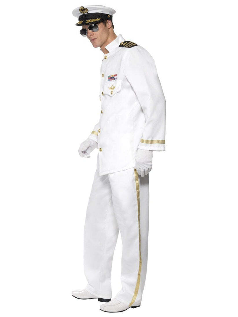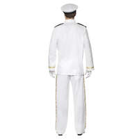 Our men's Captain Deluxe fancy dress costume is in the top 5 of our Most Popular Men's costume. This great costume will have the ladies hearts fluttering as who can't resist a man in Uniform. The costume includes a white military style jacket which features black and gold epaulettes and gold button detailing. The left faux pocket of the jacket has gold embroidery and service ribbons above the faux pocket Also included are white trousers which have a gold strip going down the leg, A pair of white gloves and an authentic looking military captains hat are also included with this great costume. Add a pair of aviators to complete this look! ready to set sail?