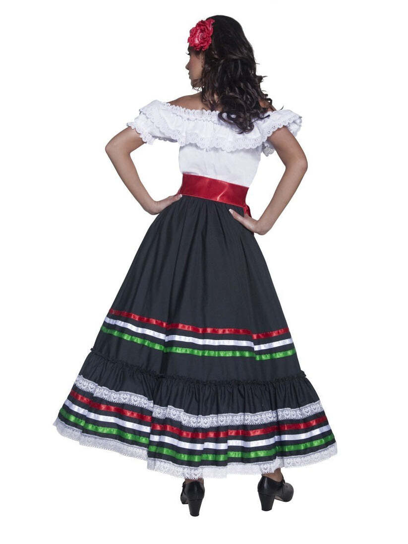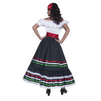 Look amazing at your next Mexican themed event in our fabulous women's sexy Senorita Fancy dress costume. The costume comes with a Mexican style Dress and a Red satin sash. The top of the dress is made from White stretch fabric dress with off the shoulder sleeves decorated with ruffled lace and printed floral details. The bottom of the dress features a full black satin skirt with ruffled hem line. The hem of the skirt has red, green and white ribbons to decorate. To add a touch of class to the dress is a Red Satin sash which is worn around the waist. Please note: Rose hair clip, shoes, and fan are not included.