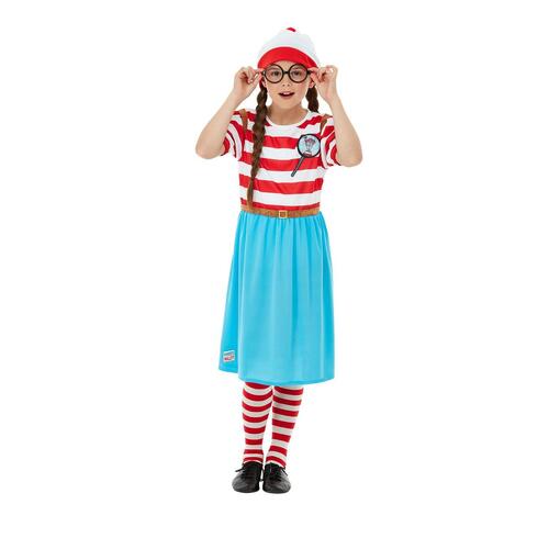 Where's Wally? If Wenda can't find him then we're in big trouble. Transform yourself into this lovable book character in our Where's Wally? Wenda Deluxe Costume. This cute costume includes the Dress with Red & White Striped Top with a 3D Print of Wally on the front. There is a print on the back of Wally's backpack. The dress has a Blue knee length skirt bottom with the Wally logo with an attached belt. Also included is the Bobble Hat, Red and White striped Tights & Glasses.